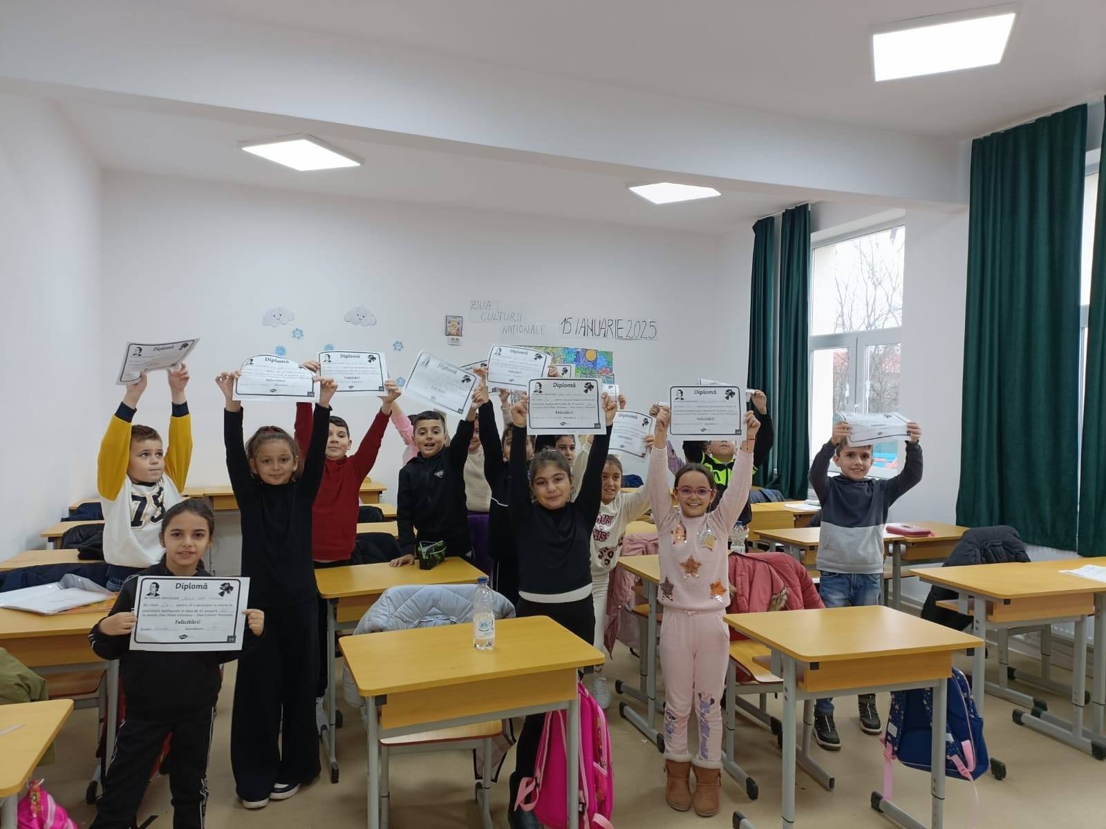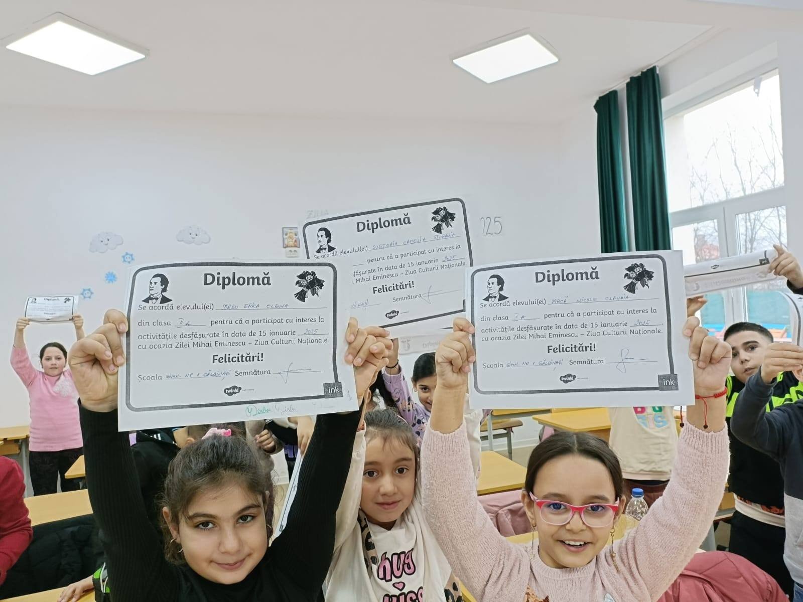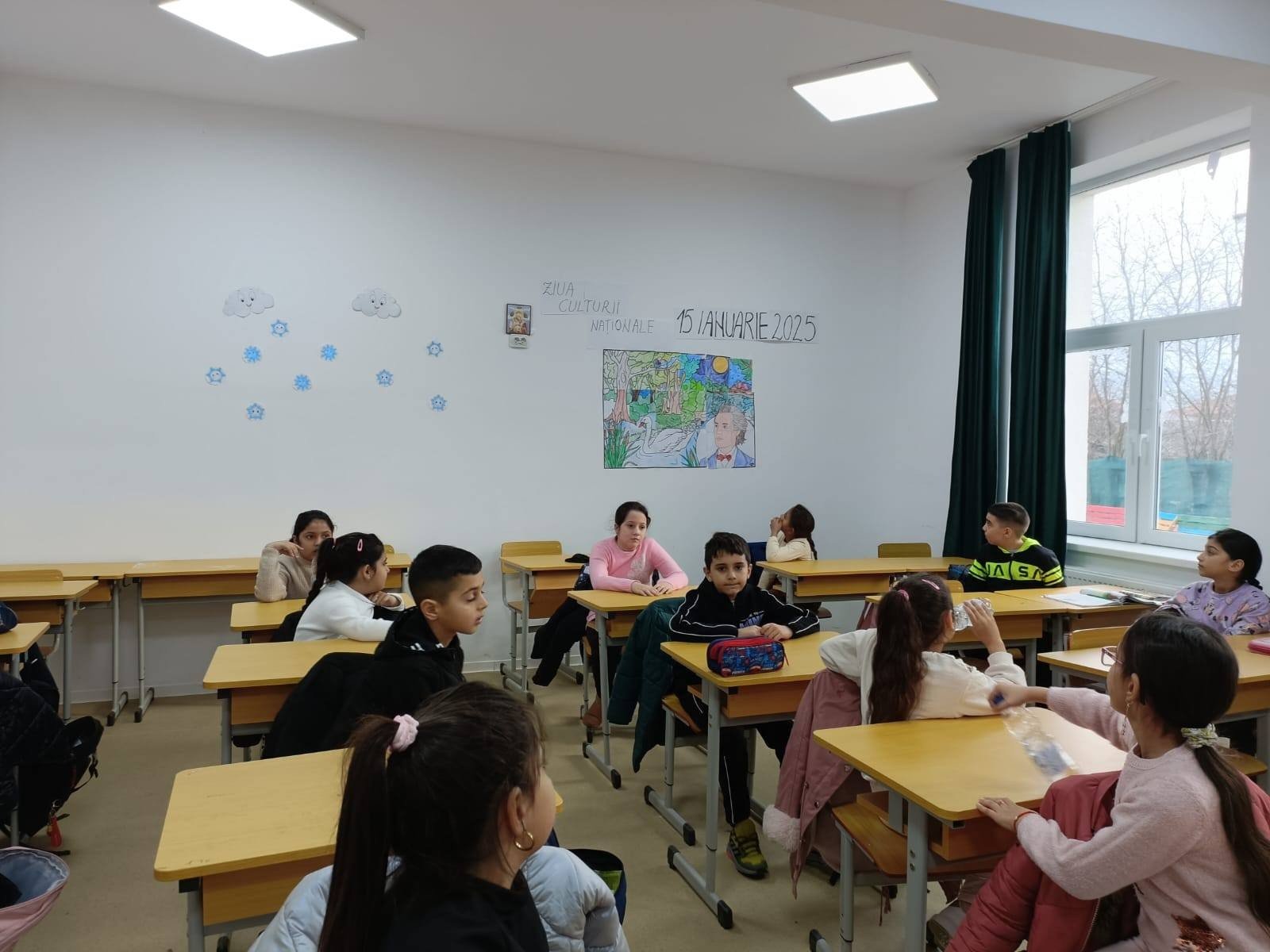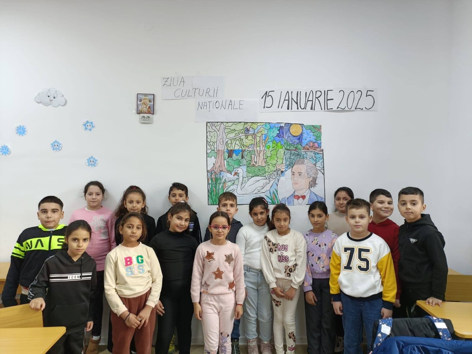 Mihai Eminescu, marele poet al neamului romanesc, sărbătorit de elevii clasei a II a, îndrumați de doamna învățătoare Maldes Violeta.