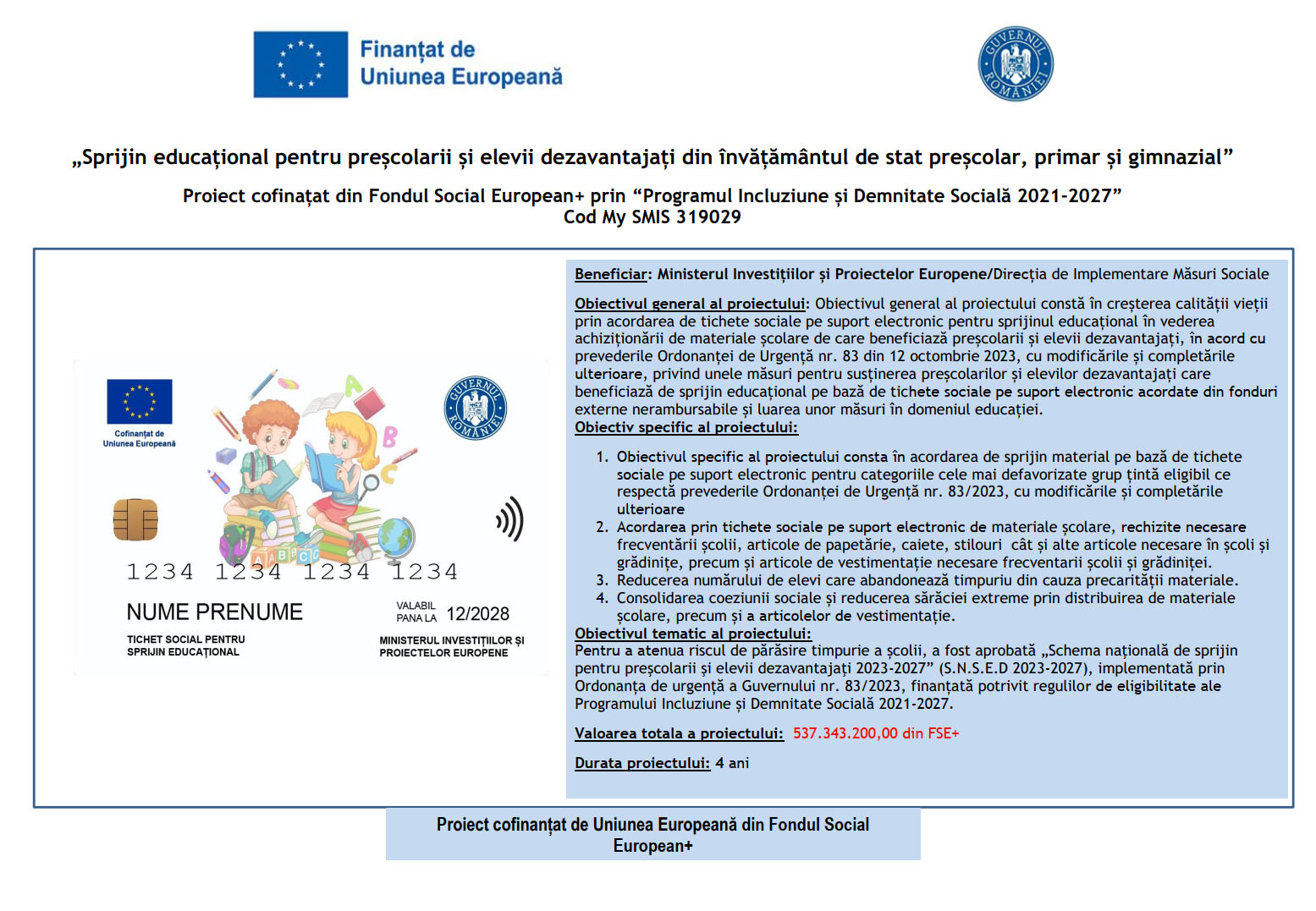 Obiectivul general al proiectului: Obiectivul general al proiectului constă în creșterea calității vieții prin acordarea de tichete sociale pe suport electronic pentru sprijinul educațional în vederea achiziționării de materiale școlare de care beneficiază preșcolarii și elevii dezavantajați, în acord cu prevederile Ordonanței de Urgență nr. 83 din 12 octombrie 2023, cu modificările și completările ulterioare, privind unele măsuri pentru susținerea preșcolarilor și elevilor dezavantajați care beneficiază de sprijin educațional pe bază de tichete sociale pe suport electronic acordate din fonduri externe nerambursabile și luarea unor măsuri în domeniul educației.